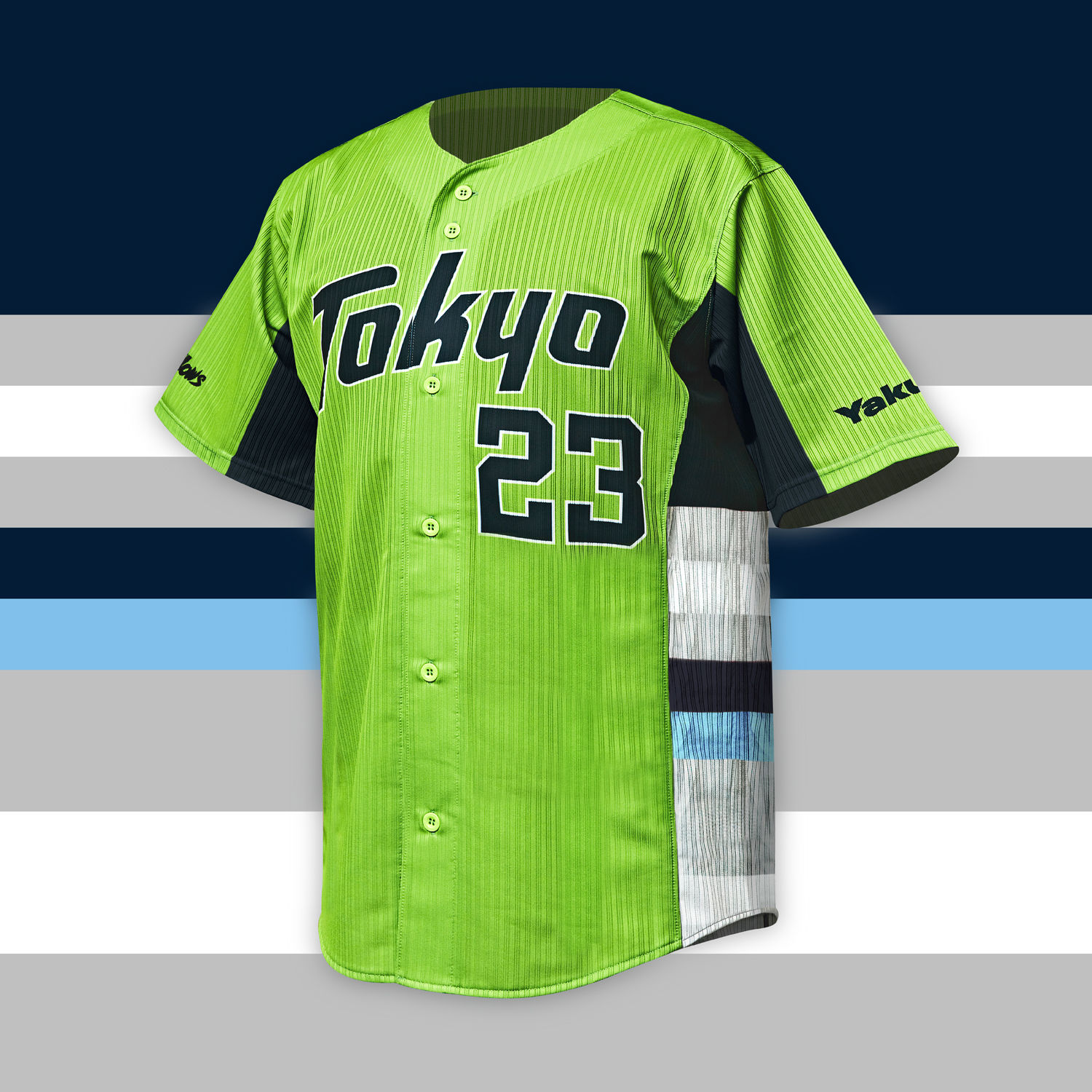 ネイビーをメインとしたユニフォームに、ライムグリーンの胸マークがキリッと光るデザインです。